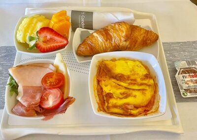Auf Reiseflughöhe angekommen beginnt der Service zunächst mit einer Getränkerunde. Dabei wurde das Konzept beibehalten, angefangen bei 1A mit einem Wagen bis 1K. Besondere Erwähnung findet dieses Konzept, da es Zeit kostet, bis jeder Fluggast ein Getränk oder sein Gericht bekommen hat. Bisher in der 2-2-2 Konfiguration ist mir das so gar nicht aufgefallen. Erst jetzt auf diesem Flug habe ich es auf 5A mitbekommen, wenngleich ich nicht wie 1K betroffen war. Weiter geht es mit den drei Vorspeisen auf einem Tablett. Bereits von unseren bisherigen Flügen wissen wir, bei Condor wird man garantiert satt. Auch die neue Condor Business Class macht da keinen Unterschied, nach der Vorspeise ist nicht mehr viel Platz für den Hauptgang. Dabei wird jeder Gast individuell gefragt, welcher Hauptgang es denn sein soll und eigens aus der Galley serviert. Zum Abschluss noch ein Dessert, präsentiert vom Wagen, allerdings bin ich so satt, das passt nicht mehr hinein. Schlussendlich gibt es etwa 1 Stunde 45 Minuten vor Landung noch ein Frühstück, lecker war es sagt Stefan.