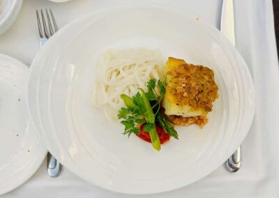 Wie bereits von unseren letzten Flügen bekannt, beginnt der Speiseservice mit den malaysischen Saté-Spießen. Dabei legt die Flugbegleiterin großen Wert darauf, dass diese sich zum Beispiel von den anderen der Region unterscheiden. Bedenken sollte man, dass es sich hier um Amuse-Bouche handelt, was ja schon recht deftig ist. Schließlich geht es weiter mit der Vorspeise und immer wieder werden Getränke angeboten. So schnell kann man das Glas fast nicht austrinken, als dass in der Malaysia Airlines A350 Business Class nachgeschenkt werden will. Besonders erwähnen möchte ich an der Stelle auch die Präsentation der Speisen. Ausgesprochen ansprechend, das findet man in einer Business Class nicht überall so vor.