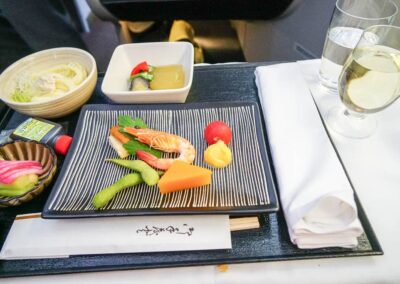 Nach Erreichen der Reiseflughöhe beginnt unmittelbar der Service. Zuerst werden wir gefragt, welche Wahl wir bezüglich der Speisen gewählt haben. Für diesen Flug stehen ein westlich orientiertes Menü und ein japanisches Menü zur Auswahl. Westlich haben wir zu Hause, also fällt die Wahl auf die japanische Variante. Bei diesem Flug serviert Malaysia Airlines vom Wagen und so kommen auch schon die ersten Getränke. Da es ein Flug über drei Stunden ist, werden auch alkoholische Getränke serviert. Flüge unter drei Stunden sind alkoholfreie Flüge, was wir auf diesem Flug erfahren haben.
