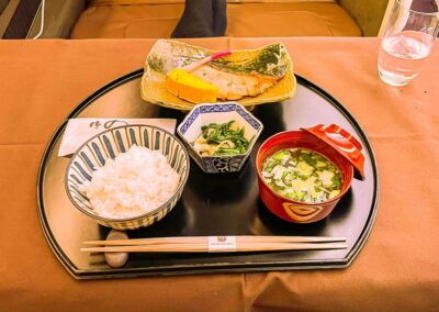 Stets passt die Präsentation der Speisen, jeder Teil des Gedecks muss auf den Millimeter genau stimmen. So wurde die Position der Stäbchen um nur zwei Millimeter korrigiert. Genau hier wird ein First Class Gefühl vermittelt und der Japan Airlines First Class Gast darf sich zurecht als ein solcher fühlen.